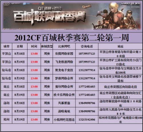 赛事说明:此比赛为腾讯官方比赛不收取任何费用。2012CF百城秋季联赛河南赛区选拔赛,总计三轮比赛,第一轮比赛城市郑州、开封、许昌、焦作、新乡,第二轮比赛城市驻马店、商丘、洛阳、平顶山,第三轮比赛城市郑州、濮阳、安阳、南阳、漯河。比赛报名为比赛当天现场报名,中午12点半为报名截止时间,报名截止后裁判有权不接受玩家报名。