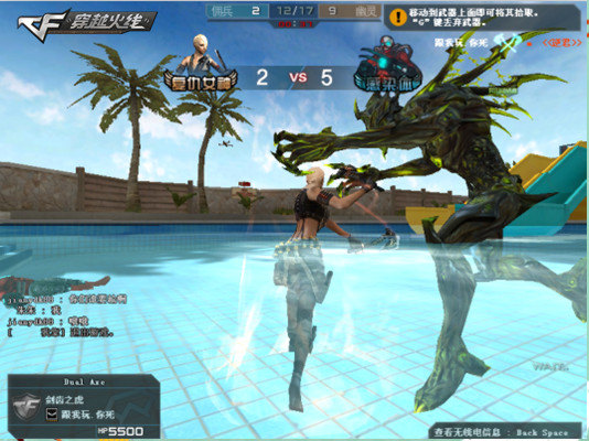 在生化酒店这张图中,由于泳池周围的注水铁架和喷泉的存在让佣兵有了多重选择。佣兵既可以占领注水铁架,通过用手中的机枪将幽灵打入注水道内将幽灵冲走来保护自己,也可以在喷泉附近通过喷泉将自己射入空中来与生化幽灵周旋。同时佣兵还可以通过喷泉飞上附近的椰子树进行防守。利用水流的冲击作用与幽灵周旋让此图变得其乐无穷。