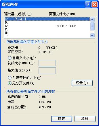之后你随便选个剩余空间大的分区,选择“自定义大小(C):” 然后在“初始大小(MB)(I):”和“最大值”;里面输入就行了,在初始大小输入实际内存的1.5-2倍大小,在最大值处输入实际内存的3倍,然后点“设置”-“确定”完成设置, 最后要提示你重启,重启就OK啦!