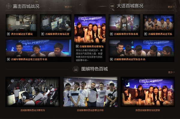 “直击百城战况”和“大话百城赛况”,以花絮视频、专访视频的方式,记录各大赛区的决赛、特色的主题月冠军争夺赛的精彩战况和内容。“图解特色百城”则以图片展示的方式,与玩家们一同分享百城联赛战场上的众多精彩瞬间,记录各大赛区的玩家们的点点滴滴。