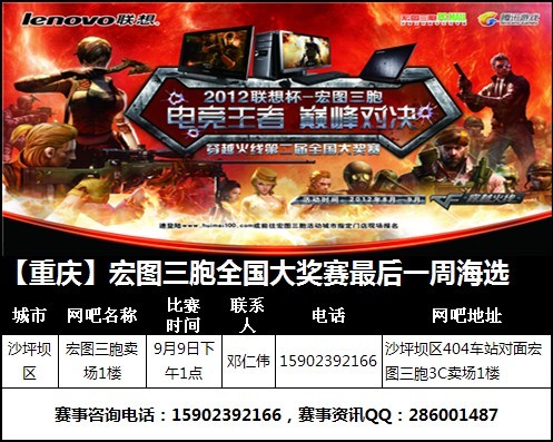 火热的夏季,激烈的赛事,丰厚的奖品,本周起,我们迎来了联想杯-宏图三胞全国大赛重庆站海选赛,各类黄金装备等你来赢!比赛安排:2012年9月9日下午1点:沙坪坝404车站对面宏图三胞3C卖场1楼-腾讯游戏比赛区域。
