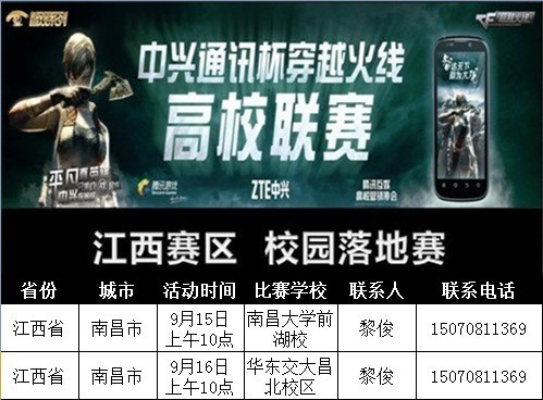 战火硝烟,“中兴通讯杯”穿越火线高校联赛江西赛区于9月15日-16日南昌市火爆开赛!经过上一周激烈首战的开始,你是否已经燃烧起激昂的斗志,拿起属于你的那一把武器,来加入战斗吧!激烈的赛事、丰厚的奖励,你还在等待什么?高校的冠军梦想等待着你来实现!