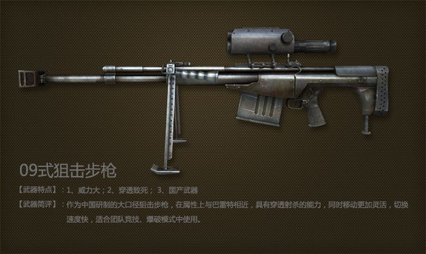 中国研制的大口径狙击步枪,其具备结构紧凑、性能可靠、射程远、精度较好等特点。威力与世界知名的巴雷特狙击枪相当,但重量更轻,使用时的移动更加灵活,后坐力较低,便于玩家开火后再次开镜。