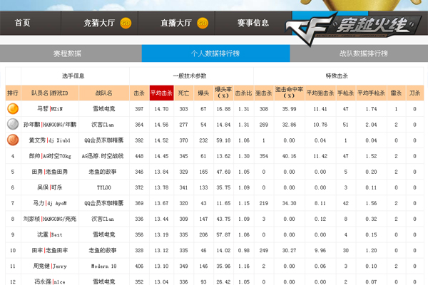 近日,CFPL2012年度第二赛季常规赛结束,相关个人数据正式出炉,来自常规赛冠军队伍“雪域电竞”的马哲(ID:MZiN)以14.70的单场平均击杀获得常规赛“击杀王”,即ACE称号,来自常规赛亚军队伍“汉宫Clan”的孙年鹏(ID:HANGONG|年鹏)则以1.3140的击杀比获得常规赛“最有价值选手” ,即MVP称号。