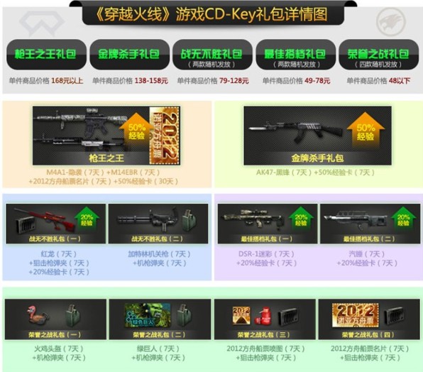 荣誉之战礼包弹夹、头盔、喷图、名片一应俱全;最佳搭档礼包与战无不胜礼包分别包括红龙、加特林机关枪、DSR-1迷彩、汽锤与经验卡,众多礼品将助玩家畅享火线对决;金牌杀手礼包为AK47-黑锋与经验卡,而枪王之王礼包为M4A1-隐袭、超人气M14EBR、方舟船票名片与经验卡。