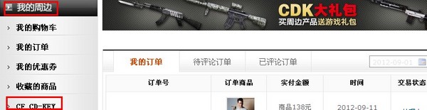 CFer购物付款成功之后,商城系统会自动赠送对应的CDK礼包进入玩家账户。登陆商城点击“我的订单”,在“我的周边”下方点击“CF CD-KEY”即可查看到“CF游戏 CD-KEY”。复制相应的CDK序列号之后即可进入官网“http://cf.qq.com/web201105/cdkey.shtml”进行兑换。