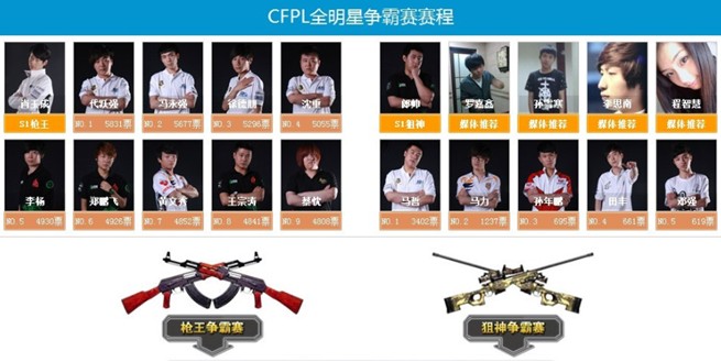 CFPL第一赛季狙神郎帅(70KG)、枪王肖玉成(xyz),作为20名全明星选手当中的种子选手,直接晋级。其他选手均为玩家投票产生。