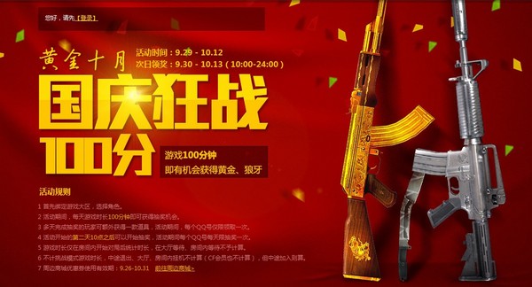 中秋,国庆双节即将来临,CF为玩家们准备了丰富的活动,国庆狂战100分活动震撼上线,只需在线100分钟就能获得丰富礼品,游戏生活两不误,丰富的武器任君挑选。
