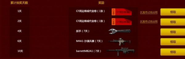 前两天完成任务可以领取CF周边商城代金券,连续4天完成任务可以领取扳手。连续6天完成任务,可以领取M4A1沙漠风暴,连续10天完成任务更可领取终极武器barrettM82A1,狂战荣誉奖,你能完成多少天?