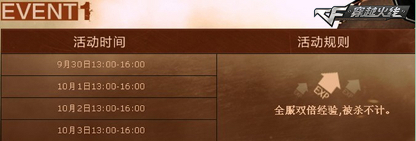 9月30日、10月1日、10月2日与10月7日的13:00-16:00,CF将在全部服务器开展双倍经验和被杀不计活动。玩家无需再顾忌因为被杀而影响战绩数据,只需要在活动期间战个痛快,双倍经验同样能够帮助玩家快速升级,获得更给力的军衔。