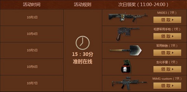 10月3日至10月7日每天的15:30,CFer准点在线次日还将获得M60E3、毛瑟军用手枪、军用铁锹、生化手雷与M4A1-custom等火线好礼。