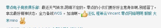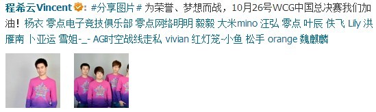 在这条微博中我们还看到了零点电子竞技俱乐部的队服。程希云也在微博中励志:为荣誉、梦想而战,10月26号WCG中国总决赛我们加油!