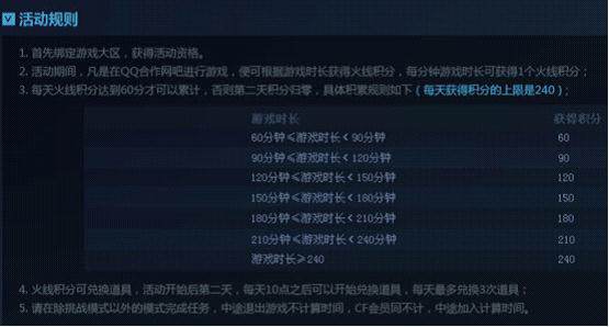 在活动期间(10月18日——11月30日),玩家们只要在QQ合作网吧中进行游戏,便可根据游戏时长获得火线积分,每分钟游戏时长可获得1个火线积分,游戏时间超过60分计入统计,第二天将进行清空,重新计算,每日积分不超过240分。