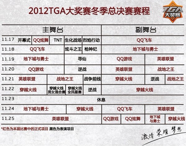 激情再度点燃,竞技梦想在这里起航!TGA大奖赛冬季总决赛赛程31日正式公布。本次赛事的正式赛事项目继续涵盖腾讯游戏旗下CF、DNF、LOL和QQ炫舞等众多竞技类游戏,同时在赛程上也与此间举办的腾讯游戏嘉年华(TGC)做了结合。赛程安排显示,11月17日至22日,TGA大奖赛冬季总决赛将和6月的夏季总决赛一样,采取电视联赛的形式进行,而正式比赛项目的部分总决赛则安排在TGC现场进行,将线上赛事和线下赛事做了充分的结合。