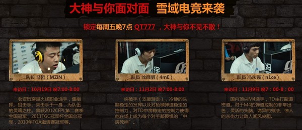 除了得到惊喜的豪礼之外,10月19日、11月2日和11月9日,QT777频道晚7点还会有大神与你相约,“火线之声”邀请到知名战队雪域电竞队长以及成员马哲,徐得朋,与玩家面对面交流,零距离感受冠军的风彩。