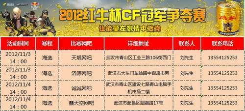 Cfer们,百城的战场已然结束,相信你们一定还没有过足隐,别着急,我们为你们精心准备了另一场战役——2012红牛杯CF冠军争夺赛。在这里,红牛将给予你们正能量,来一罐红牛,让能量在我们的激情中燃烧吧!报名参赛,即可免费得红牛一罐哦!