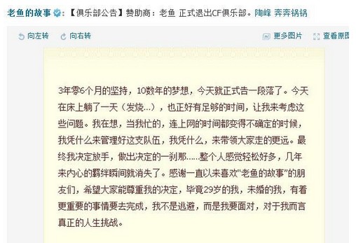 老鱼的故事也在微博中说明了退出CF俱乐部的原因,以下为原文:3年零6个月的坚持,数10年的梦想,今天就正式告一段落了。今天在床上躺了一天(发烧),也正好有足够的时间让我来考虑这些问题。我在想,在我忙的连上网的时间都变得不确定的时候,我凭什么来管理好这支队伍,我凭什么来带领大家走的更远。最终我决定放手,做出决定的一刹那整个人感觉轻松好多,几年来内心的羁绊瞬间就消失了。感谢一直以来喜欢“老鱼的故事”的朋友,希望大家能尊重我的决定毕竟29岁的我,未婚的我有着更重要的事情要去完成,我不是逃避而是我要面对,对于我而言真正的人生挑战。
