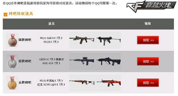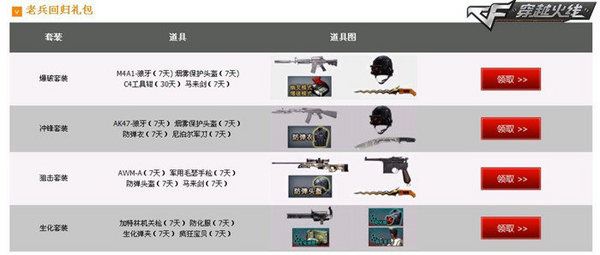 为了迎接老兵的回归,除了赠送“老兵回归礼包”之外,还特别推出老兵每日免费抽奖。在10月17日至11月11日活动期间,回归玩家每天完成8局游戏(挑战模式除外),次日可参加抽奖。“黄金M4A1”、“黄金AWM”、“黄金沙鹰”等稀有道具将助老兵重新拿回属于自己的那份火线荣耀。另外,网吧用户还可以领取额外的网吧特权道具,如虎添翼,助新老玩家赢得这场之间上的战争。