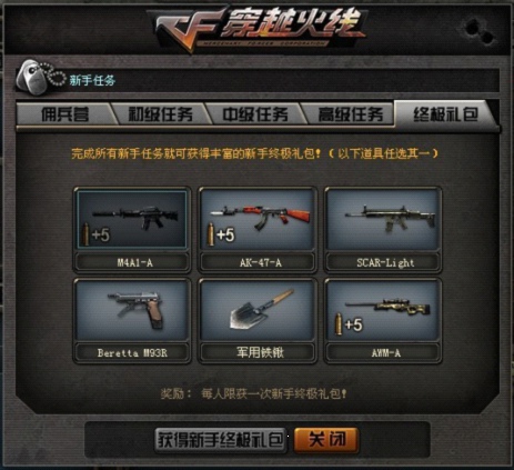 每个小任务完成并回到大厅后,系统将自动弹出任务完成提示及奖励展示,完成全部15个任务后,玩家还可在丰富的新手终极礼包中选择心仪的道具展开火线之旅:M4A1-A、AK-47-A、SCAR-Light、Beretta M93R、军用铁锹、AWM-A等奖励静候新兵领取。