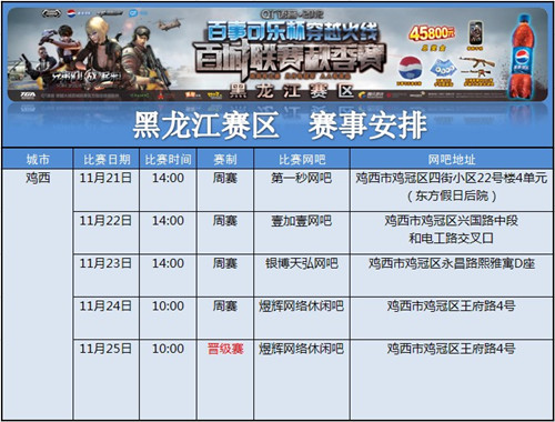 百事可乐杯穿越火线百城联赛秋季赛黑龙江赛区本周城市外卡赛来到了鸡西,想来参加的朋友们可千万不要错过哦!连续五天的赛事,团队间的默契大比拼即将展开,快来参加吧!