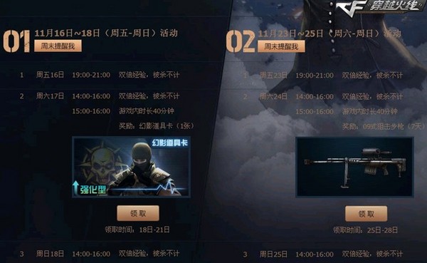 在11月16日-11月25日的活动时间内,每周五晚上19:00-21:00,周六和周日的14:00-:16:00,这三个时间段中,都有双倍经验,被杀不计的福利。助新手玩家快速升级,让广大CFer纵意战场。