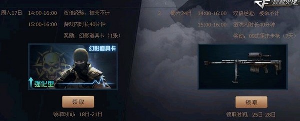 福利之余,还有惊喜送上,在特定时间段达到一定的游戏时长,即可获得游戏道具奖励,11月17日15:00-16:00在线满40分钟的道具奖励是幻影道具卡一张,使用它可以在挑战模式开出:黄金M14EBR,人物角色幻影等珍贵道具。11月24日15:00-16:00在线满40分钟的道具奖励则是游戏新推出的国产武器——09式狙击步枪。