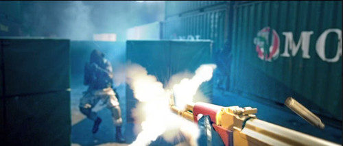 “人气超模”艾尚真作为电影唯一的女主角,她的表现受到格外的关注,她所饰演的潘多拉身手极其敏捷,这组身背冲锋枪从甲板飞身跳下,干脆利落制服对手的镜头可以看出艾尚真敬业的精神,英姿飒爽,犹如女侠。