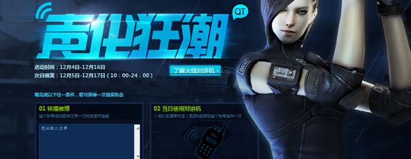 如此方便的语音作战,也为玩家带来了丰富的福利。最新上线的“声化狂潮”活动,以四种途径任选的方式,为玩家提供了宝贵的抽奖机会赢取丰厚好礼。玩家只需在官方指定页面转发微博,便可获得一次宝贵的抽奖机会。而对于在游戏中使用对讲机的玩家,CF也将提供一次抽奖机会,让玩家抽取大奖。除此之外,在QT语音的战队应用中,玩家只需每完成一次个人任务或战队任务,便可获得多次抽奖机会,抽取多重好礼。