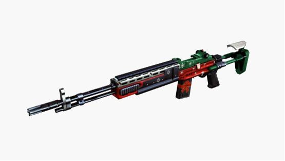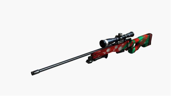 枪械简评:在属性优异的AWM基础上,增加了子弹数,同时使用圣诞节的节日皮肤,性能与外观并重,适合在团队竞技,爆破及狙击战中使用。