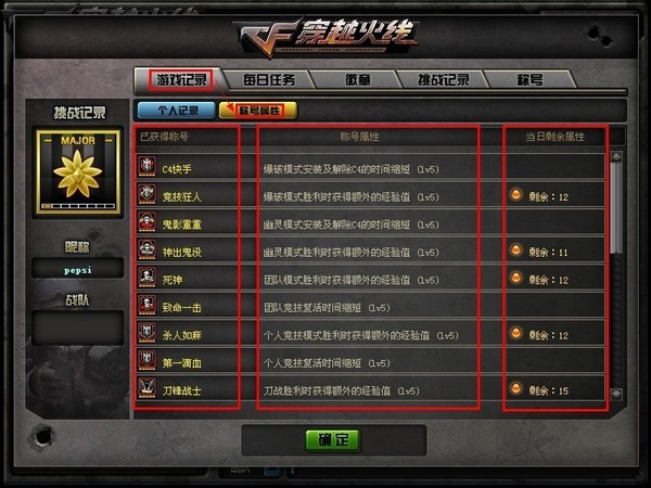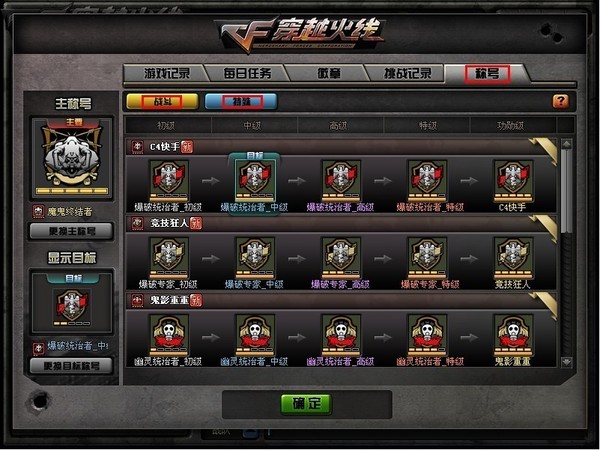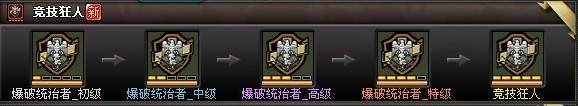 每个称号分为“初级”“中级”“高级”“特级”“功勋级”五个等级,玩家是通过完成称规定的游戏任务,逐级解锁一个系列的称号,获得更高级的属性加成。