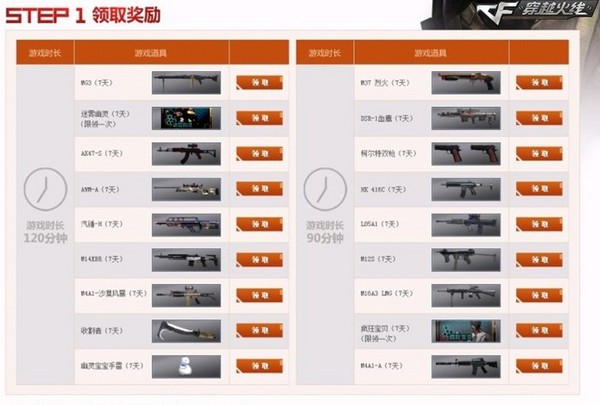 活动期间,玩家绑定好游戏大区之后,游戏时长达到90分钟的玩家,次日即可获得一次领取道具的机会,时长90分钟-120分钟的奖励道具有:生化角色疯狂宝贝、爆破利器M4A1-A等,而游戏时长达到120分钟的玩家,奖励更为丰厚,绝版武器幽灵宝宝手雷、气锤-H,还有AWM-A、M14EBR、收割者等主流道具都在其列。