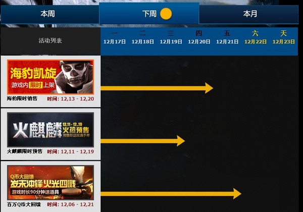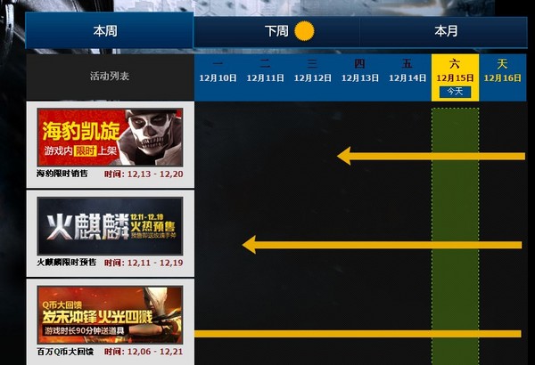 在CF活动日历中,玩家们可以轻松的查看整个月份的全部活动汇总情况,并通过选择本周、下周、今天的活动情况,查看具体能参加的活动列表。并按照日历的方式,将整个活动的进行情况进行展示,让玩家们CF活动的进展情况进行快速的了解,迅速的参与到活动中,赢取心仪的奖励。
