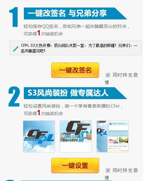 在活动页面上可以通过修改签名,告知兄弟一起目睹CFPLS3赛事,或者设置S3风尚装扮,做一个享有尊贵荣耀的CFer,就可以分别获得一次抽奖机会。而QQ会员或CFVIP用户可以额外获得1次抽奖机会。