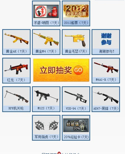 活动准备了丰富的道具作为抽奖礼品,黄金冲锋枪AK、M4,黄金毛瑟手枪,稀有道具M4A1-R,以及近身武器军用指虎等,一定有你心仪的武器,更有好玩的2012诺亚方舟船票“喷图”一张!