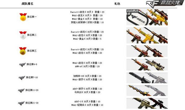 活动结束后,各个大区积分排名前30,和全服排名前50的战队可领取极品装备大礼包。礼包中有节日道具战龙系列、绝版道具茉莉系列和至尊道具黄金系列等珍惜武器,且所有道具期限都为30天。每个战队根据排名不同可领取对应数量的礼包,大区排名第一的战队还可额外获得实物奖励——穿越火线军牌。