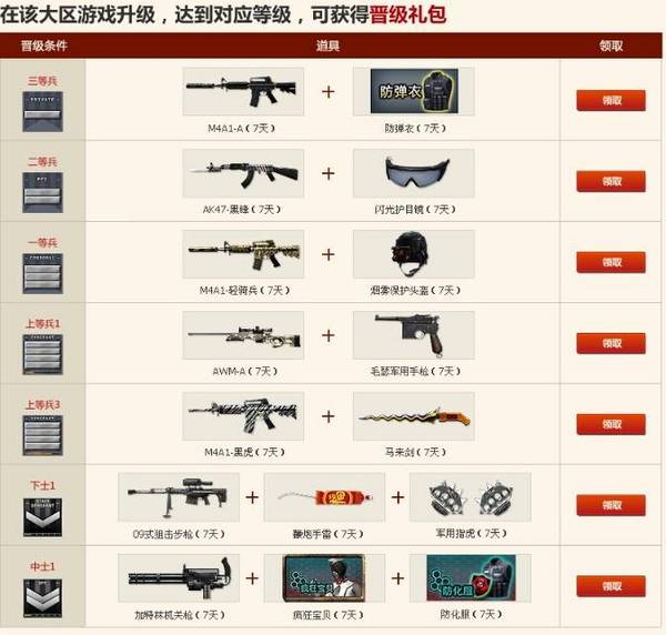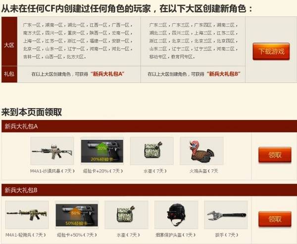 从未在CF任何大区内创建过任何角色的玩家,只需要在指定的大区创建新角色,即可领取“新兵大礼包A、B”。新兵大礼包中包含了M4A1系列枪支、水壶、扳手、烟雾保护头盔、扳手与经验卡道具,帮助玩家快速升级,步入高手行列,从此摆脱“新兵蛋子“的头衔。