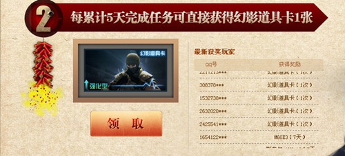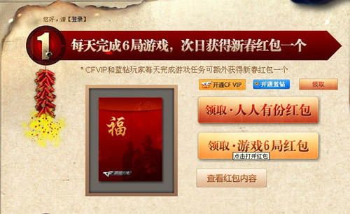 CF玩家只需要登录活动页面,即可领取新春包一个,人人有份。同时每天在任一个大区完成6局游戏,次日即可领取新春红包一个,而开通CFVIP或者蓝钻的用户每天完成游戏任务外可额外领取新春红包一个,相当给力。每累积五天完成6局游戏任务的玩家还可额外获得挑战模式专用道具”幻影道具卡“一张。
