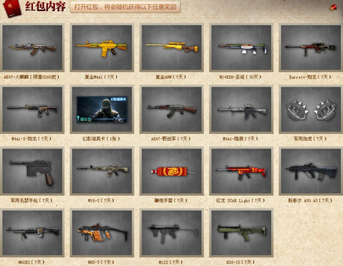 喜迎新春,此次送出的红包相当有份量,首款永久性神器AK47-火麒麟,极品***Barrett-翔龙,黄金武器M4A1、AWM,及各式冲锋枪,近身利器军用指虎,鞭炮手雷,长枪短炮,应有尽有,定有你心仪的武器。
