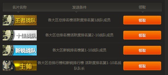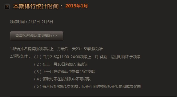 玩家必须要在上月的10号之前加入该战队,且在该战队中新增45点贡献度才可领取奖励,领取奖励时也必须是该战队的成员。上月奖励的领取时间为当月的2号-6号,每人每月只可领取一次奖励,战队队长可同时领取队长奖励和成员奖励。全队皆有,大幅提升战队凝聚力!