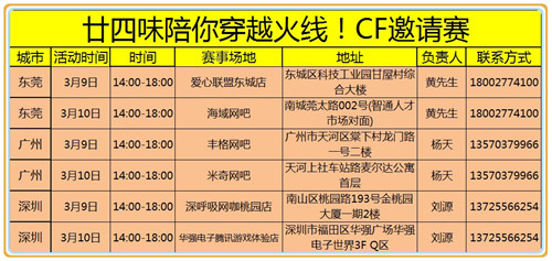 由腾讯游戏《穿越火线》与廿四味联手打造的《廿四味陪你穿越火线!CF邀请赛》在广州、深圳、东莞,三大城市火爆开启。相信现场的精英必将为我们献上令人热血沸的精彩对决!比赛还未开始,已经令人不寒而栗,数十只精英战队将在本月一绝高下,谁会赢得晋级决赛资格,让我们拭目以待!