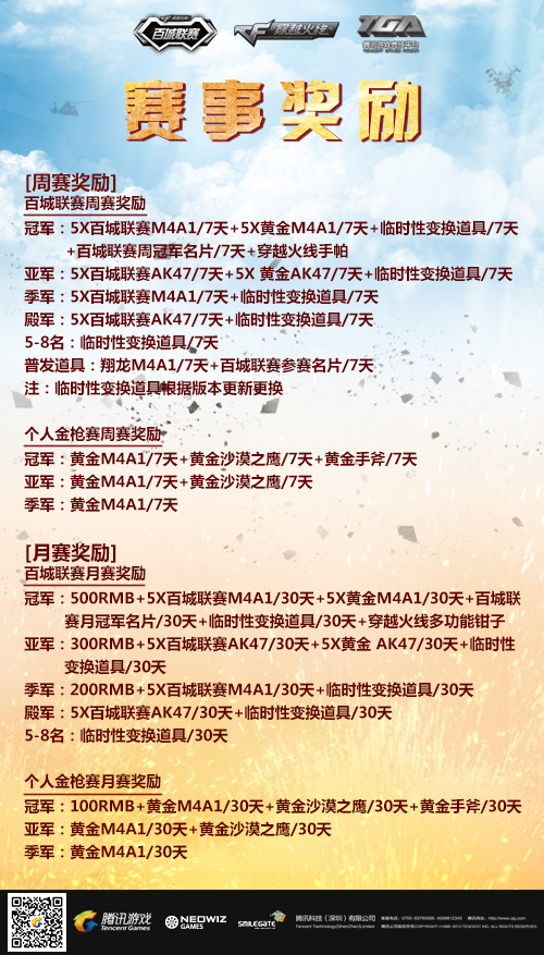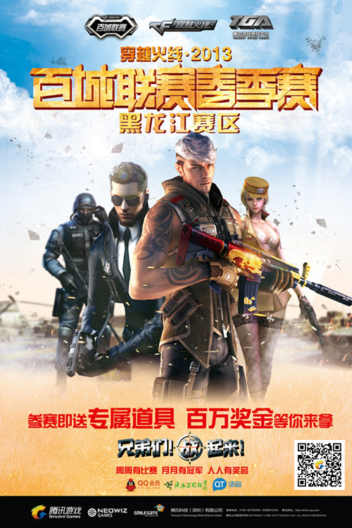 2013穿越火线百城联赛春季赛火热开启,团队激烈竞技,个人金枪赛的火热比拼,等你来参加!更有CF珍藏道具、穿越火线手帕、多功能钳子、抱枕等你赢!精彩赛事,丰富奖励,都在向你挥手!不要犹豫,打响2013年的第一枪,就在本周等你挑战!