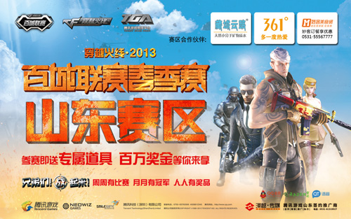2013年CF百城联赛春季赛山东赛区,藏域云路矿物质水、361°多一度热爱、妙客美食网(www.mocook.com)全力赞助,一起打造最精彩的百城联赛!除团队赛之外,三期赛事分别加入个人金枪王赛、3V3AK挑战赛、运输船爆头赛,给你充分展示的舞台!是团队冠军还是个人金枪王,是ACE还是MVP?一切,尽在2013年CF百城联赛春季赛!