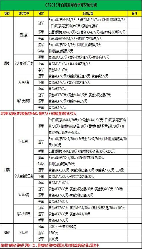 本赛事报名参赛即可获得CF限时道具M4A1-翔龙+百城联赛名片!更有各款黄金道具、百城联赛专属道具、百城联赛冠军名片以及全新制作的CF多功能钳子、CF手帕等你来拿!
