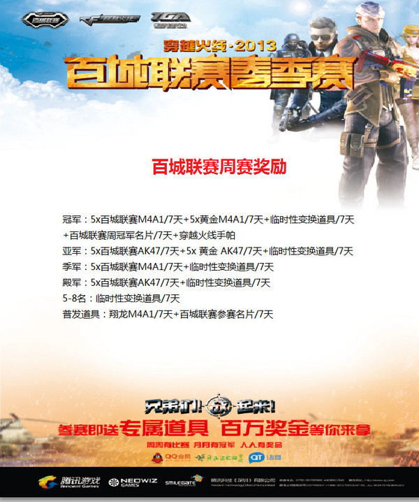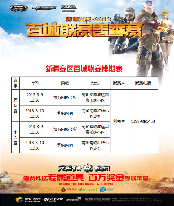 亲爱的CFer们,2013年穿越火线百城联赛春季赛中国新疆赛区的首场周赛将于3月9日打响联赛的第一枪.今年赛制有所变动,各省的省冠军直接晋级TGA全国总决赛!不要再犹豫了,今年春季赛的省冠军就是你!