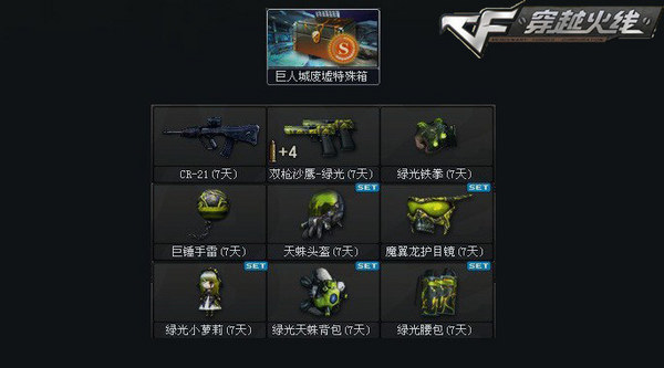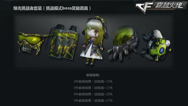 全新版本中,CF推出了全新的“挑战者套装”,包括天蛛头盔、魔翼龙护目镜、绿光小萝莉、绿光天蛛背包以及绿光腰包五大装备,让CF的角色造型更加奇趣可爱,同时“挑战者套装”的经验值加成功能,让玩家们经验升级更加轻松快速。