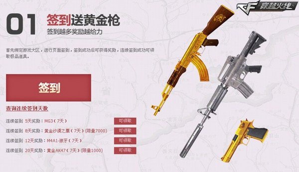 活动期间,在QQ网吧进行游戏的玩家,只需登陆活动页面,点击“签到”按钮,累计一定天数后,即可领取对应道具奖励。稀有尊贵的黄金AK47、黄金沙漠之鹰,主流武器M4A1-狼牙、MG3等签到好礼,助阵广大网吧玩家畅游火线世界。