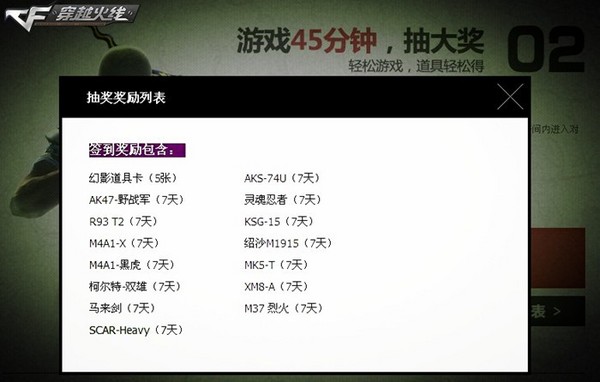 除了每日签到外,玩家当天在QQ网吧进行游戏45分钟(指加入房间对局时间),次日即可获得一次抽奖机会。奖励列表中从主流步枪AK47-野战军、M4A1-黑虎到副武器柯尔特-双雄;从幻影道具卡、灵魂忍者到近身武器马来剑;还有M37烈火、KSG-15、MK5-T、XM8-A等各式武器。玲琅满目,应有尽有,充实玩家的游戏个人仓库。