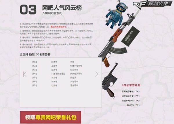 游戏官方将会在活动期间,根据当天在网吧内进行CF游戏的玩家数量以及玩家进行游戏的时长计算该QQ网吧的人气指数(更加偏向游戏时长),并以此对全国的QQ网吧进行排名,届时官方活动页面将展示出排名前100的网吧。且活动结束后,在全国排名前100网吧进行过游戏并且达到500分钟总游戏时长的玩家都可获得尊贵网吧玩家礼包一份,内中包括主武器AK47-S、副武器军用毛瑟手枪、投掷武器诅咒娃娃手雷和50%经验卡;4件套荣誉礼包,全方位装备网吧玩家。
