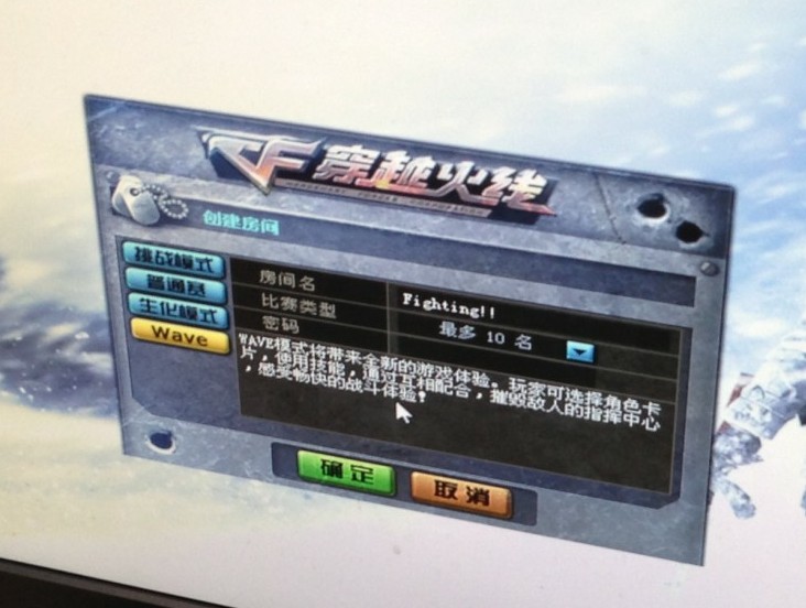 我们将这张图的重点锁定在屏幕中,屏幕中应该是穿越火线建立房间时弹出的选项,并且也区别于现在的版本。创建房间对话框上左侧有不同模式的选择,黄色背景的“Wave”应该是选中项,右边对应的是“Wave”模式建立房间时的相关选项,包括房名、比赛类型等。比赛类型有下拉列表,应该是选择游戏的人数,图片所示选择为10人,不排除还有其他人数对战的选择。