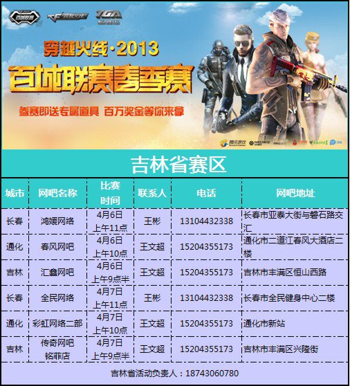 【吉林】CF百城春季赛4月份比赛将在长春、通化、吉林火热开战,在这个硝烟弥漫的战场上,只要你有胆量,有恒心,有毅力,荣誉就属于你!兄弟们,证明战队实力的时刻到了,还等什么,赶快报名参加吧!参与比赛即送普发道具翔龙M4A1/7天+百城联赛参赛名片/7天!